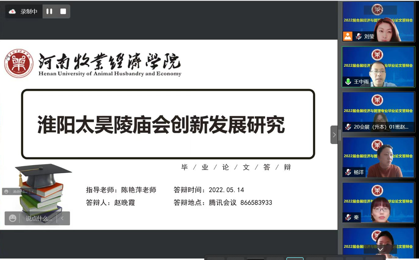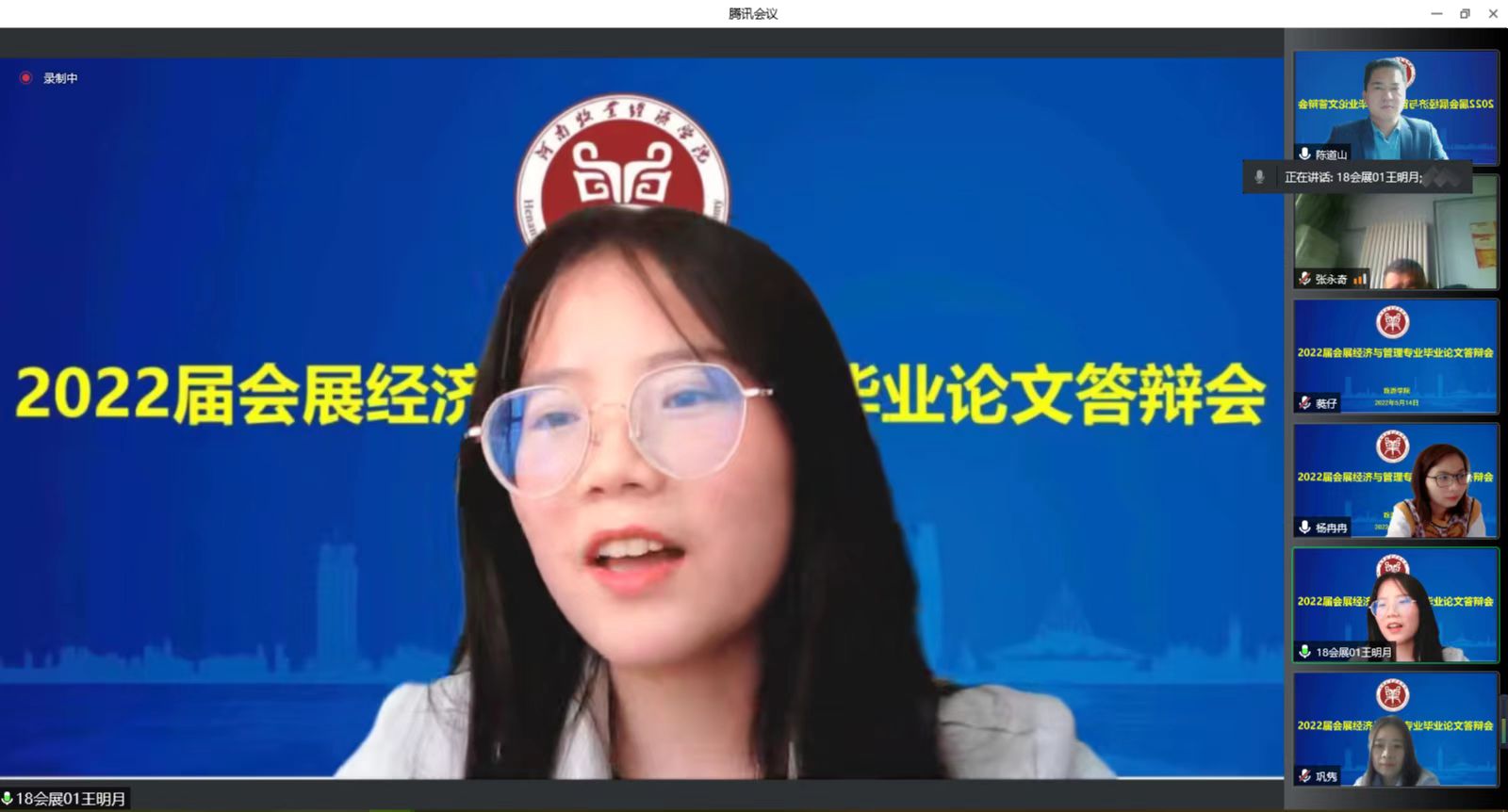5月14日,太阳tyc97282022届会展经济与管理本科专业顺利完成214人毕业论文答辩工作。受疫情影响,经学院学术委员会研究,此次答辩师生全部通过腾讯会议采用线上方式进行,分为8个答辩组,院长王德静、副院长王中雨等48位教师参与全程答辩。答辩还吸引了2019级、2020级部分同学参与观摩。