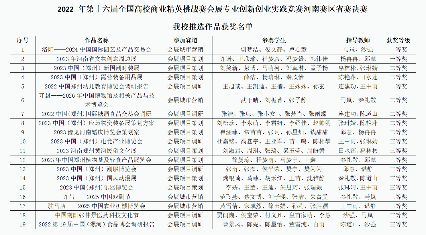 近日,2022年第十六届全国高校商业精英挑战赛会展专业创新创业实践竞赛河南赛区组委会发布决赛结果,我校太阳tyc9728推举的19个参赛项目全部获奖,其中一等奖2项目,二等奖7项,三等奖10项,9个项目获得参加全国总决赛的参赛资格。