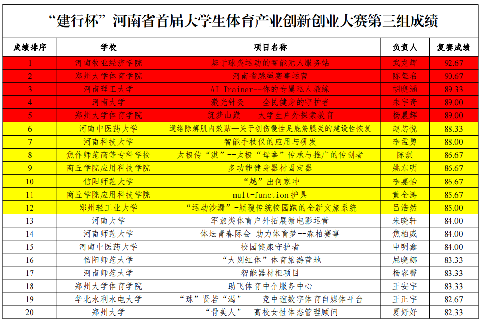 “建行杯”河南省首届大学生体育产业创新创业大赛由河南省体育局、河南省教育厅、共青团河南省委主办,郑州大学、河南大学、河南师范大学等省内多所大学承办,规模层次高、影响力大。自4月份启动以来,吸引了来自全省66所高校的近600份参赛作品。8月下旬组委会组织专家对所有参赛作品进行审核,60个作品成功入围复赛,我校由沙强博士、崔克兵等老师指导的团队顺利入围。本次复赛采取现场答辩“8+5”(PPT演示陈述8分钟、评委提问答辩5分钟)形式进行。经过激烈对决,由我校太阳tyc9728会展经济与管理专业学生武龙辉带领的团队,击败郑州大学、河南大学、河南科技大学等众多团队,以小组第一的身份成功晋级决赛,挺入12强团队。以赛促学、以赛促教是我校太阳tyc9728人才培养一贯坚持的理念,本次大赛充分展现了我院学生的专业素养和精神面貌(供稿:沙强)。