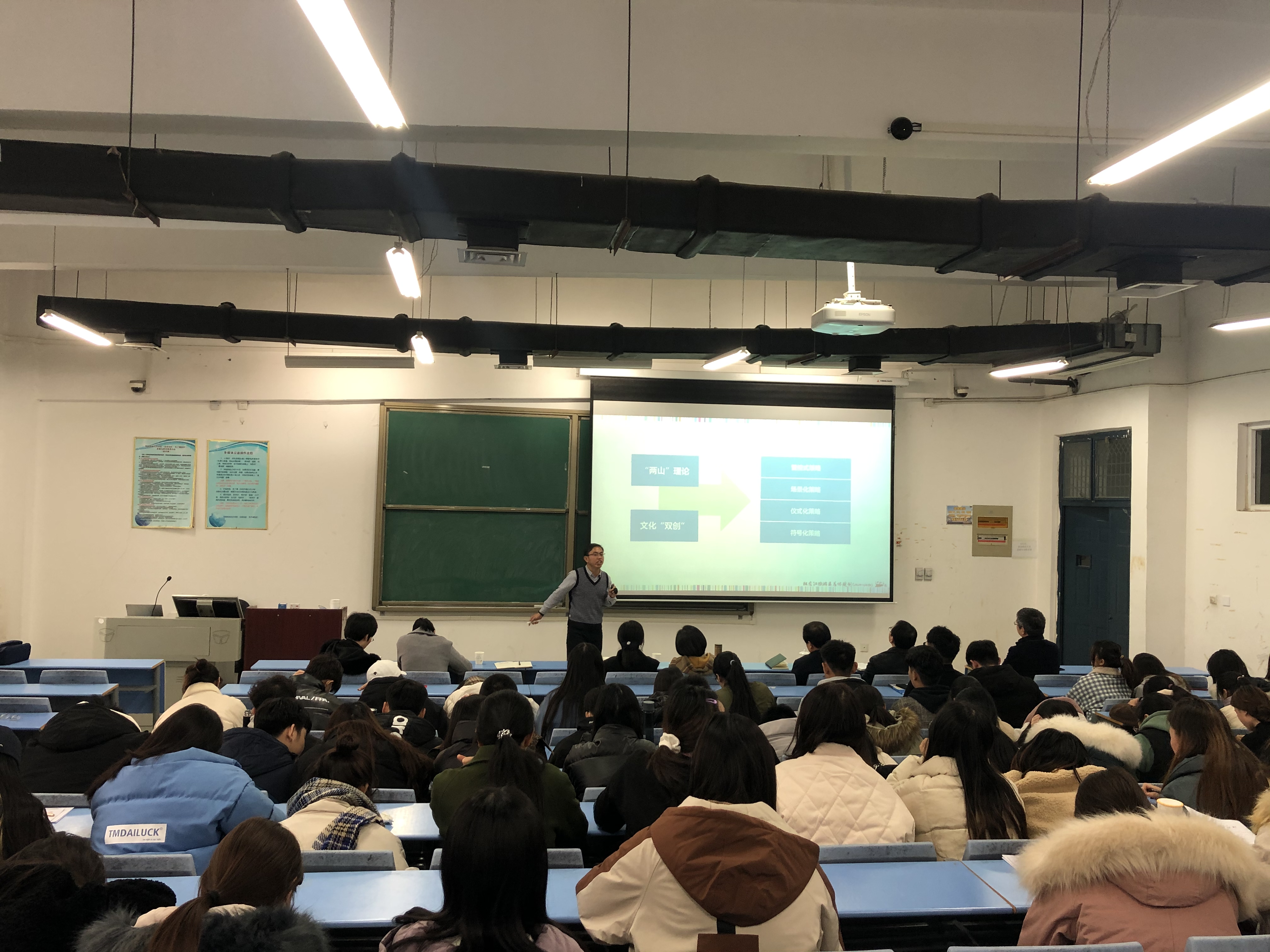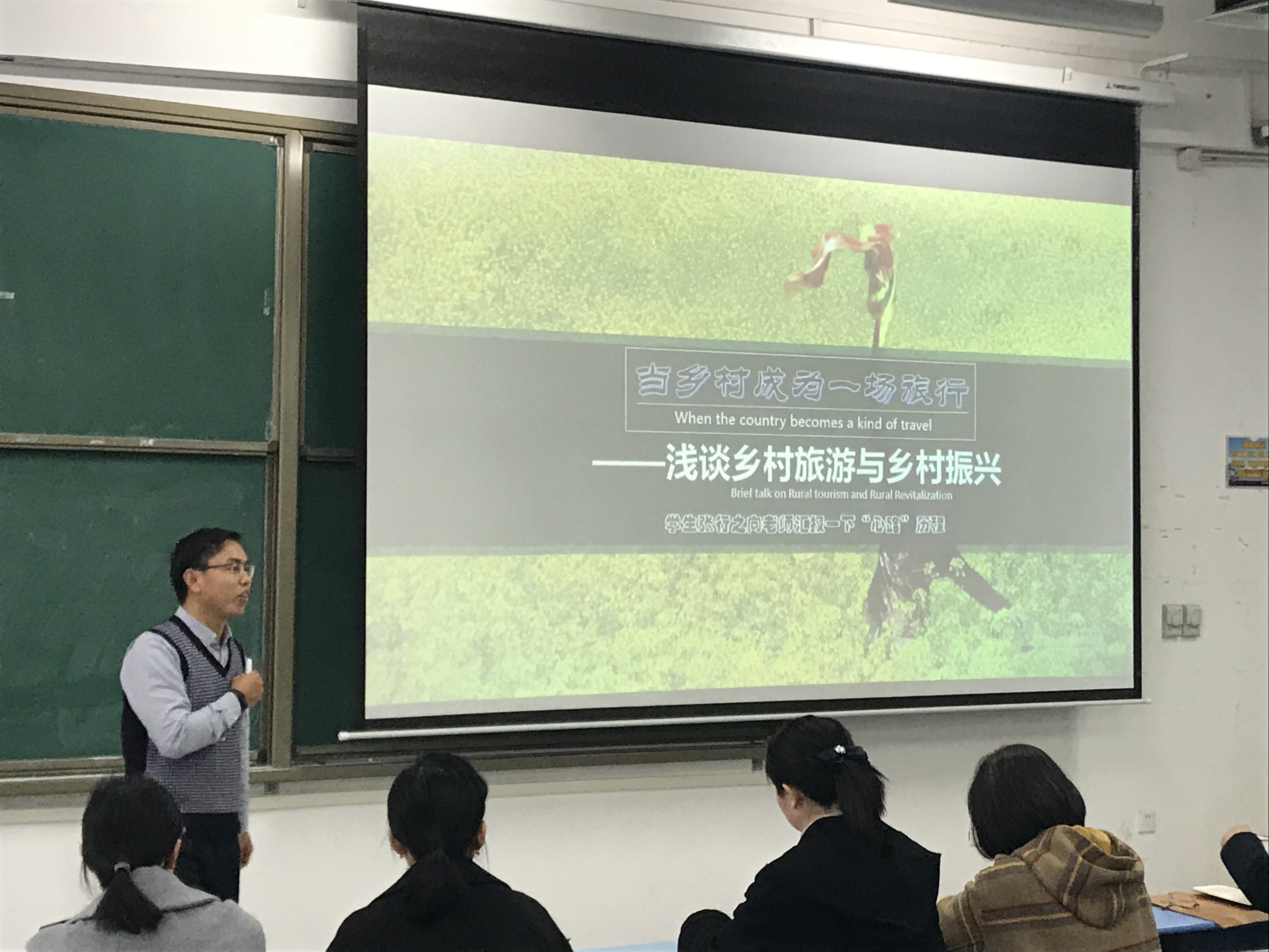 张行之院长以陶渊明《归园田居》开篇,从“我本将心向明月,奈何造化不由人——初心”、“清风知我意,无事也翻书——动心”、“白发思益壮,心玄用弥拙——用心”、“我心一片磁铁针,不指南方不肯休——真心”和“采菊东篱下,悠然见南山——归心”等五个方面进行精彩分享,让大家领略了独具风格的乡村之旅。张院长结合实际案例向太阳tyc9728师生介绍乡村旅游规划的战略选择,如以品牌创建为发展树立典型的安徽颍上八里河、以品牌创作为特色产业赋能的重庆武隆白马山、以文化创新为民俗传承铺路的云南贡山独龙江。张院长指出旅游规划的核心是为了解决实际问题,乡村旅游规划就是要结合吸引物、产品、组织和故事等核心要素,在故乡的沃土中植入一粒种子让它生根发芽,在乡村振兴中开花结果。