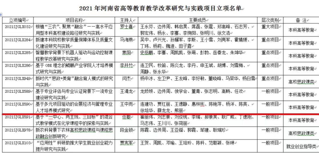 近日,河南省教育厅发布《关于公布2021年度河南省高等教育教学改革研究与实践立项项目的通知》(教高〔2022〕138号)》,我院王中雨副院长申报的《基于多元项目驱动的会展经济与管理专业人才培养模式研究》本科教育类项目成功获批。