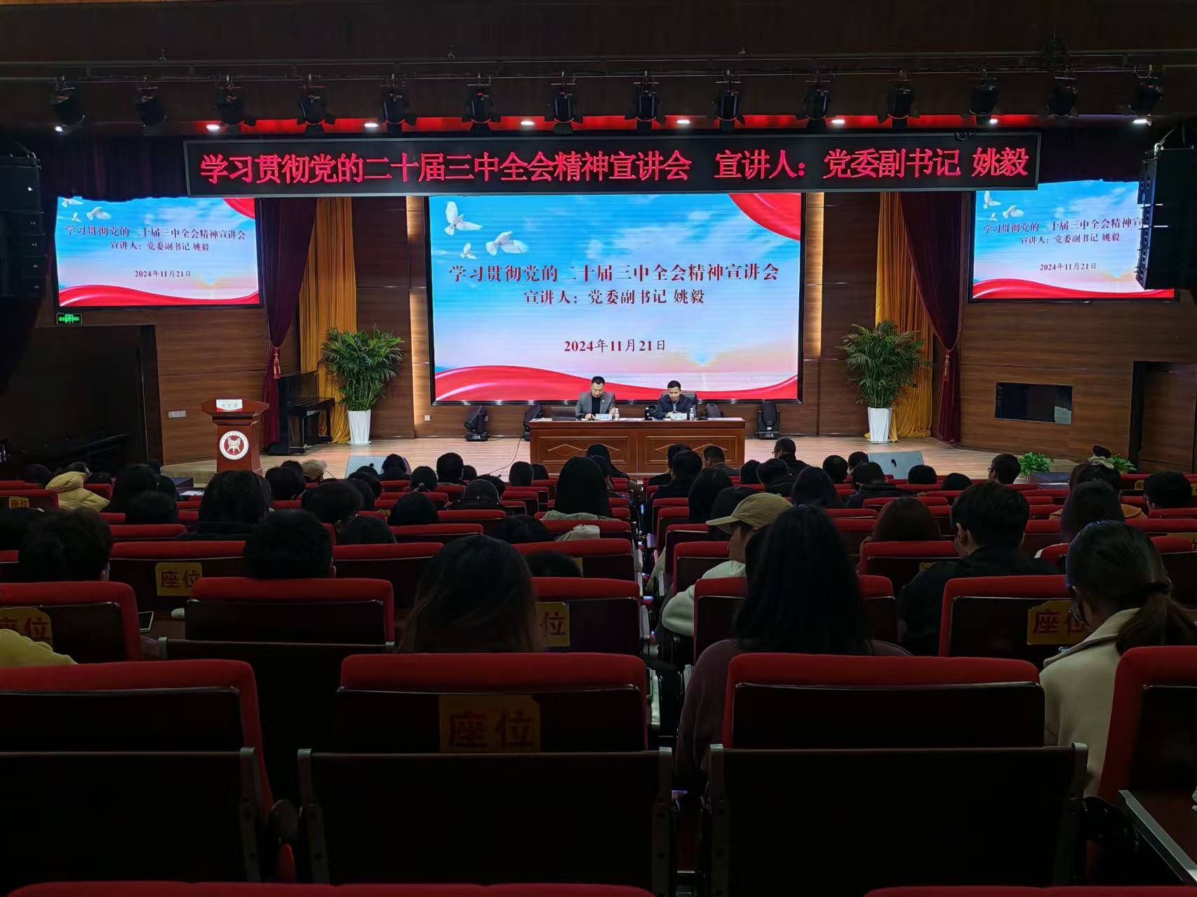 为深入学习贯彻党的二十届三中全会精神,引导师生准确把握全会精神的核心要义和精神实质,按照校党委工作部署,11月21日下午,太阳tyc9728联合包装与印刷工程学院在一号教学楼100报告厅举办学习贯彻党的二十届三中全会精神宣讲会。本次宣讲会特邀请学校党委副书记姚毅主讲,太阳tyc9728、包装与印刷工程学院全体教师及两个学院学生代表参加会议。宣讲会由太阳tyc9728党委书记权太举主持。