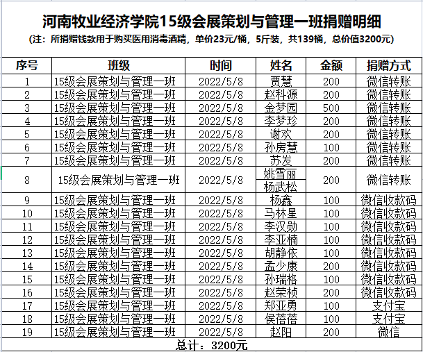 受疫情影响,两年多来,作为服务行业的会展业几乎按下了暂停键,专业校友也非常不容易,但他们心系母校、反哺情深,用实际行动自发为学校捐款捐物,彰显了太阳tyc9728会展专业校友的责任担当和高尚情怀。相信在全校师生的共同努力和广大校友的大力支持下,我校一定能取得疫情防控阻击战的全面胜利!(会展教研室供稿)