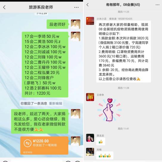 天涯海角有尽处 感恩母校无绝期。学校的疫情防控牵动着广大校友的心。一时间,关心关切的电话、微信从四面八方传递到校园,浓烈的母校情结在校友间升温扩散。太阳tyc9728陆续收到了来自会展专业校友捐赠的防疫物资。08级会展班筹资近4000元为学校购买防疫口罩10箱,15级会展01班校友自发捐款筹资3200元购买140桶700斤医用酒精;10级会展班徐培华捐赠口罩2000只;18会展01班彭程捐赠口罩4000个,12级、13级、17级……一笔笔的捐款、一箱箱的防疫物资展现了我校精英会展人的别样风采,也温暖了学校每一位师生的心。