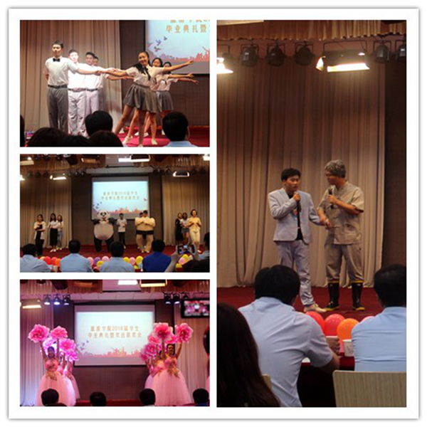 随后的联欢节目中,欢笑之中夹杂着泪水,尽情的表达着同学们对母校的热爱与感激之情。舞蹈《花开千万朵》漂亮开场,美轮美奂;走秀、华尔兹《从你们的全世界路过》彰显了大学生的青春活力,青春在肆意飞翔;两首歌曲串烧将我们的舞台气氛推向了高潮;小品《孝》以搞笑与幽默的风格赢得了同学们的朗朗笑声;魔术表演既神奇又充满温情,现场掌声阵阵。最后15级的学长学姐们给大家带来的抖音神曲串烧将我们的舞台气氛又推向了另一个高潮。随着快门声的响起,典礼在合影中落下序幕,所有的不舍、感激、祝福、憧憬和期盼都用相机定格在了这个美好的瞬间。