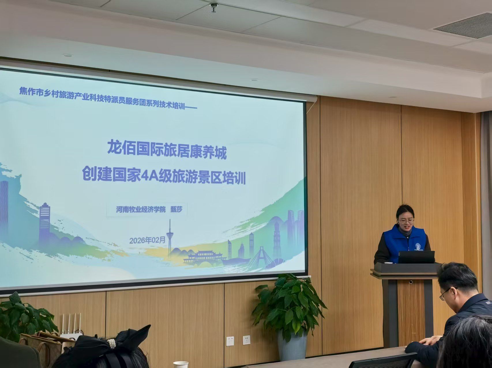 为推动焦作市解放区乡村旅游产业升级,助力龙佰国际城创建国家4A级旅游景区,2月26日下午,太阳tyc9728院长王中雨教授带领乡村旅游产业科技特派员服务团3人奔赴龙佰国际康养城开展培训。