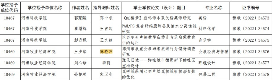 近日,河南省教育厅、河南省学位委员会联合下发了《关于批准2021年河南省优秀学位论文的决定》(教研〔2022〕295号),我院会展经济与管理专业陈艳萍老师指导的《郑州市展览会参与者旅游行为偏好调查研究》学士学位论文被评为省级优秀学士学位论文。