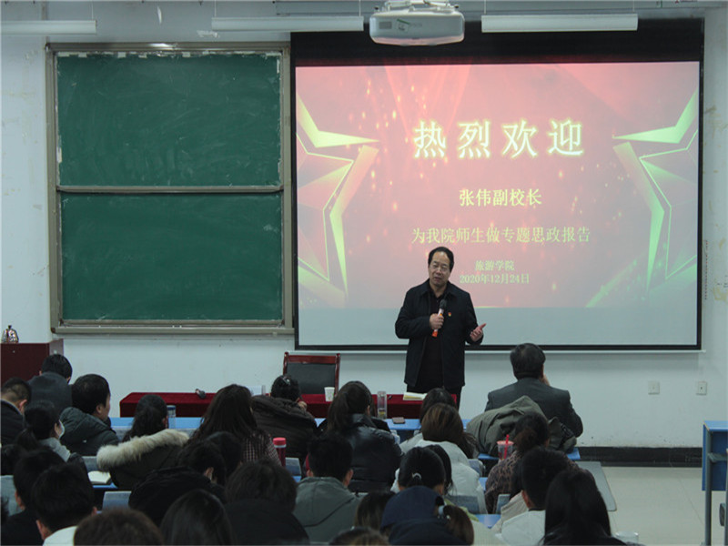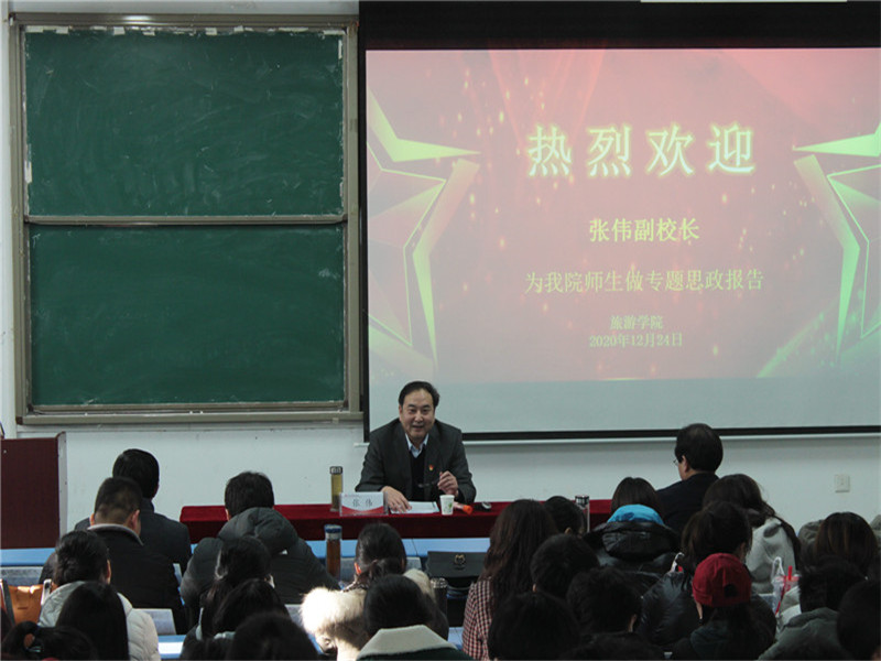 12月24日下午,副校长张伟于一号教学楼合301教室为太阳tyc9728师生带来一场生动的专题思政报告,学院全体教师及团学会学生干部近200人聆听了报告。报告会由太阳tyc9728党委书记李喜民主持。