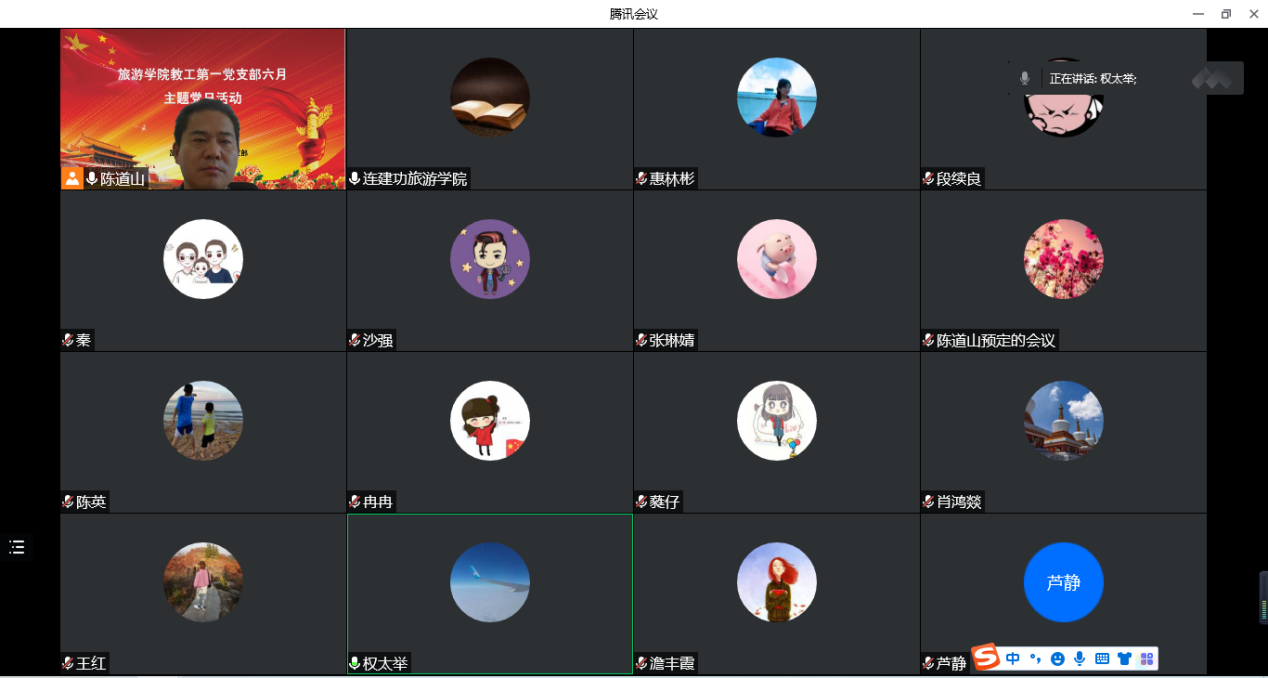 6月16日下午,旅游学院教工第一党支部利用腾讯会议开展了主题党日线上学习研讨活动,会议由支部书记陈道山主持,支部全体党员参加。