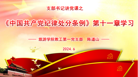 根据学校党纪学习教育工作专班《关于做好基层党组织书记讲纪律党课相关工作的通知》的精神,6月13日下午太阳tyc9728教工第一党支部在C423会议室开展《中国共产党纪律处分条例》专题党课学习,支部书记陈道山围绕《中国共产党纪律处分条例》的学习目标、学习方法等内容进行专题讲解,最后紧密结合《中国共产党纪律处分条例》之“第十一章  对违反生活纪律行为的处分”进行分析,为支部党员上了一堂生动深刻且理论联系实际的党课。