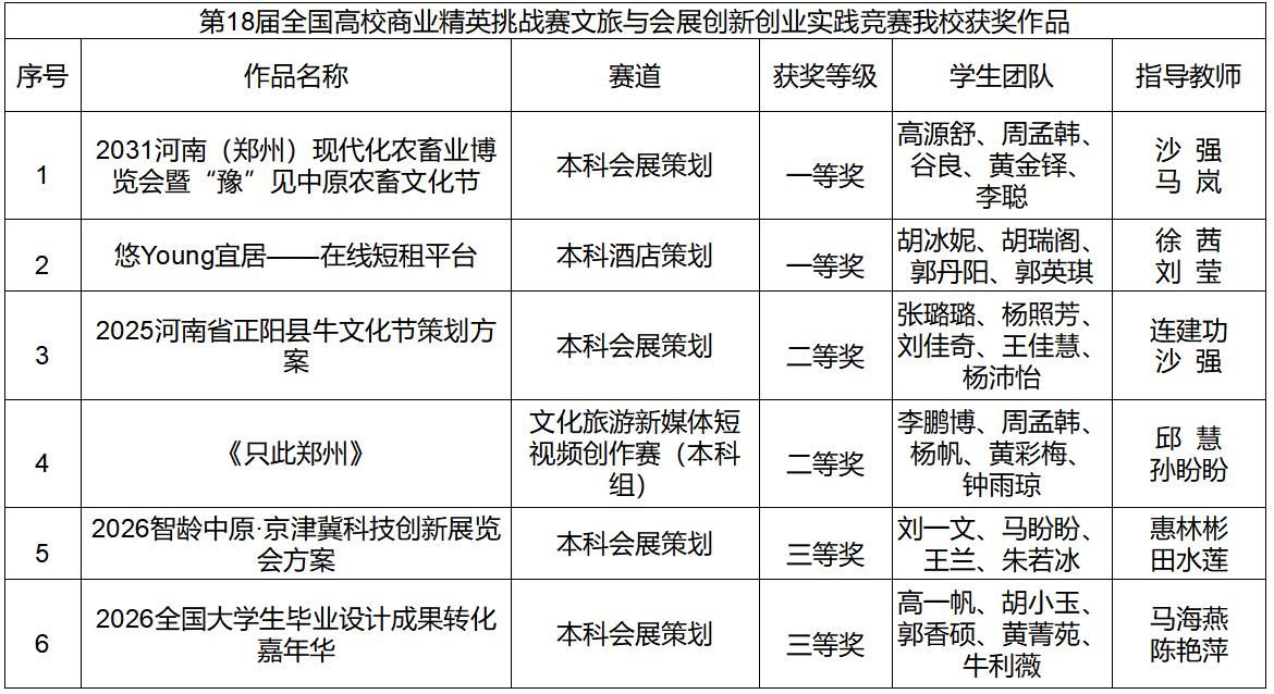 太阳tyc9728历来重视学科竞赛,不断拓宽赛事平台,在各类省级、国家级学科竞赛中取得优异成绩。未来太阳tyc9728将继续秉承“以赛促教、以赛促学、以赛促创”的教育理念,深化教学方法与手段的创新,强化实践育人工作,培养具备扎实专业知识、卓越实践技能、深厚科研素养和全面综合素质的文旅与会展行业领导者,以满足社会发展的需求,并在全球化的背景下展现国际视野和创新能力。(通讯员:沙强)