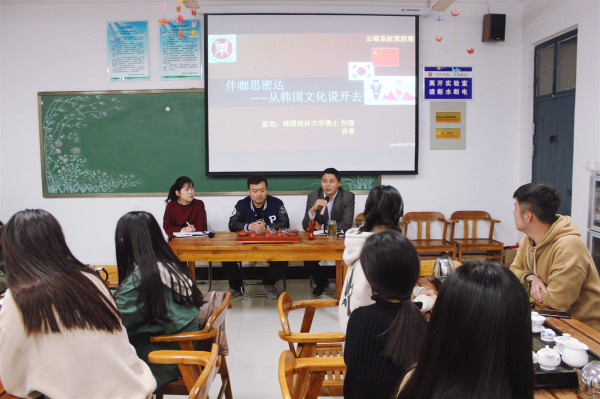 众所周知,韩国与中国一衣带水,在古代深受儒家思想熏陶,是东方文明的另一个独特映射。在当代,韩国又成为了一个具有一定影响力的文化输出国家。中韩文化之间的交流碰撞,对我们会有灵感迸发,亦会有困惑迷茫。霜降之夜,在我院党总支副书记陈明的主持下,特邀从韩国培材大学学成归来、现任会展教研室教师的沙强、乔曼博士与同学们相约二号教学楼顶端的茶艺实训室,一起在漫漫茶香之中,开启一场名为“伴咖思密达――从韩国文化说开去”的精神之旅。