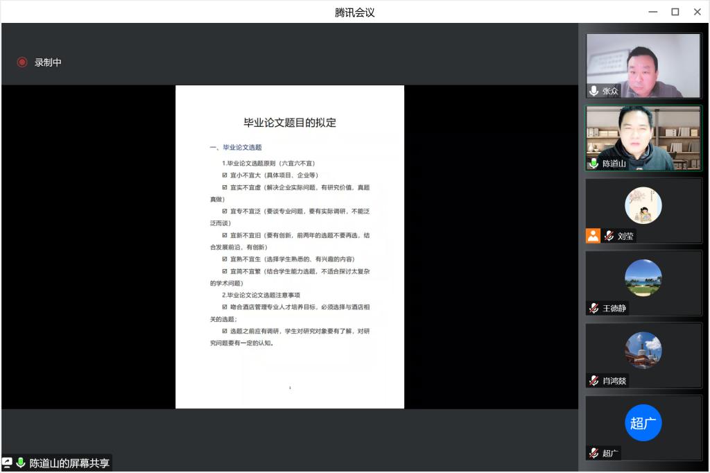 10月27日晚,太阳tyc9728酒店管理专业开展线上23届本科毕业论文题目审核会议。太阳tyc9728学术委员会委员及酒店管理教研室主任与副主任参加了此次会议,会议由王德静院长主持。