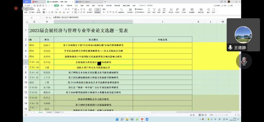 为提高本科毕业论文选题质量,2022年10月28日晚,我院利用腾讯会议召开2023届会展经济与管理专业本科毕业论文选题线上审核会,会议由会展经济与管理教研室主任连建功主持,学院学术委员会全体成员和部分教师代表参加会议。