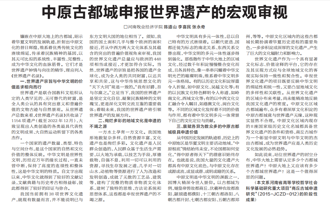 12月14日,《河南日报(农村版)》刊发我院“商丘古城申遗研究”课题组的《中原古都城申报世界遗产的宏观审视》研究文章。文章指出,世界文化遗产的宗旨与中华文明的价值追求相向而行,我国绚烂多彩的地域文化是申遗的不竭之源,镶嵌在中原大地上的古都城,以其无可比拟的系统性、丰富性、完整性,成为中华文化的血脉筋骨,极具有申遗价值。