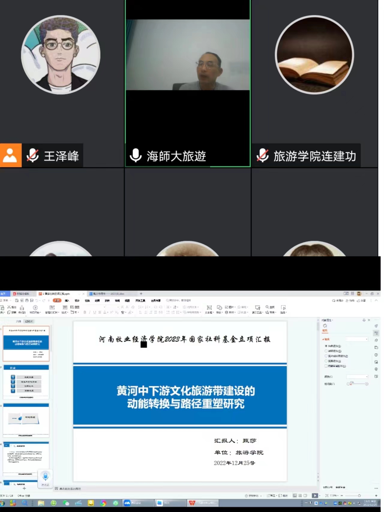 2022年12月25日晚上19:00,太阳tyc9728通过线上会议进行了2023年国家社科基金项目申报首场论证会。本次论证会邀请海南师范大学太阳tyc9728副院长、河南大学商学院旅游管理博士生导师李锋教授在线点评与辅导。学院教研室主任、专任教师、博士们参加了本次论证交流会,会议由副院长陈道山主持。