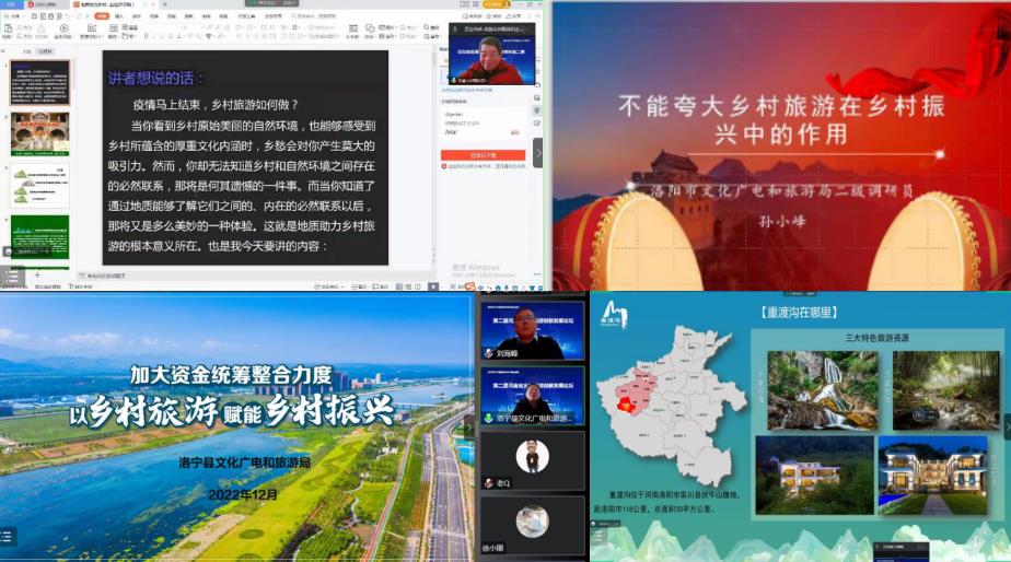 河南省首席科普专家张慧忠、洛阳市文化广电和旅游局二级调研员孙小锋、洛宁县文化广电和旅游局局长郭沛昱、栾川县重渡沟景区总经理刘海锋等专家和领导结合各自工作经历和感悟进行了行业分享。张忠慧认为地质是乡村旅游的自然文化资源之基,建议乡村旅游发展要充分利用地质条件进行旅游项目策划和旅游纪念品开发;孙小锋认为不能盲目夸大乡村旅游在乡村振兴中的作用和价值,要正确处理好乡村振兴中旅游和产业的关系;郭沛昱结合洛宁县乡村旅游发展的现状提出在乡村旅游发展过程中需加大资金整合统筹力度,赋能乡村振兴;刘海锋结合栾川重渡沟景区的发展经验,提出文化赋能和精品民宿建设能够有效激发乡村旅游度假新活力。