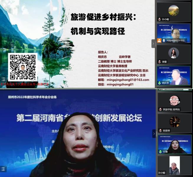 论坛特邀云南财经大学首席教授、博士生导师明庆忠,郑州大学教授、博士生导师任瀚分别以《旅游促进乡村振兴的机制与实现路径》、《河南省乡村旅游发展特色和疫后复苏预测》为题做专题报告。明庆忠在报告中提出旅游促进乡村振兴的“五大机制、三大路径”,既有理论高度,又有现实丰度,为河南省乡村旅游的创新发展提供借鉴;任瀚结合河南省乡村旅游发展的特色和典型案例对疫后乡村旅游的复苏做出预测,为河南省乡村旅游未来发展指明方向。