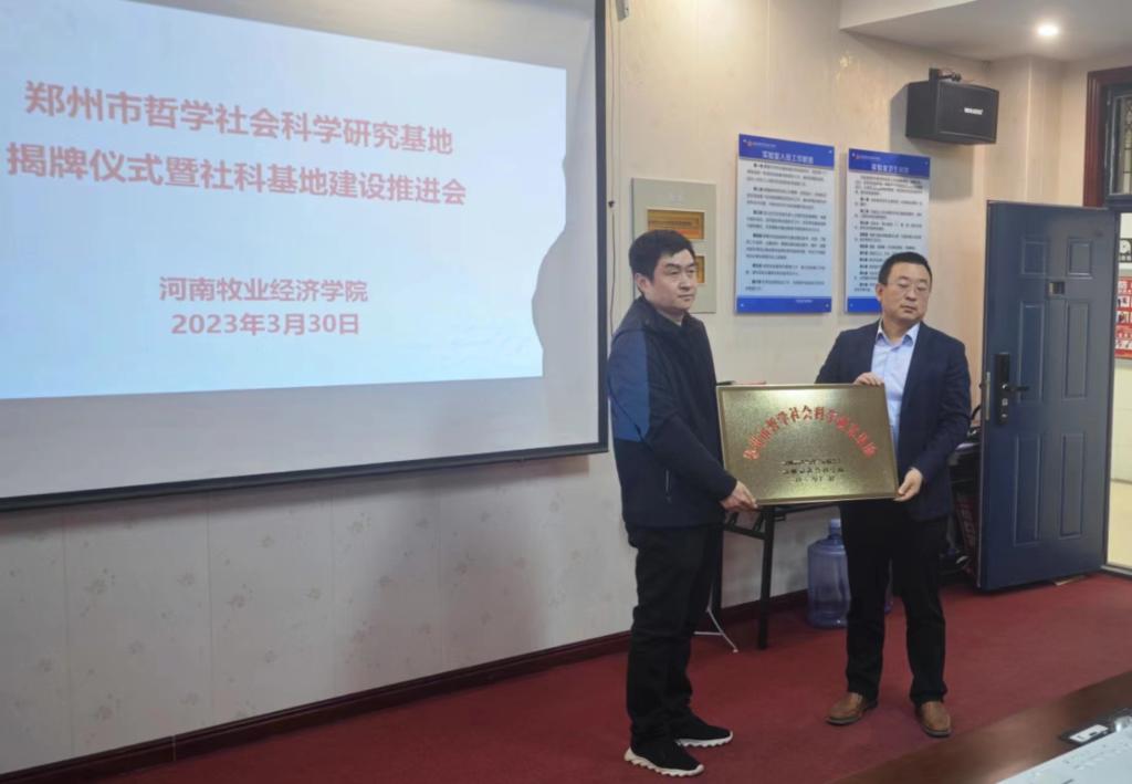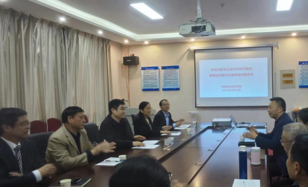 3月30日下午,郑州市哲学社会科学研究基地揭牌仪式暨社科基地建设推进会在太阳tyc9728C423会议室举行。郑州市社科联杨发聚部长、科技处副处长张红霞、郑州市哲学社会科学研究基地负责人、各社科院(部)科研副院长、科研办主任及教师代表等出席会议。太阳tyc9728副院长王中雨主持会议。