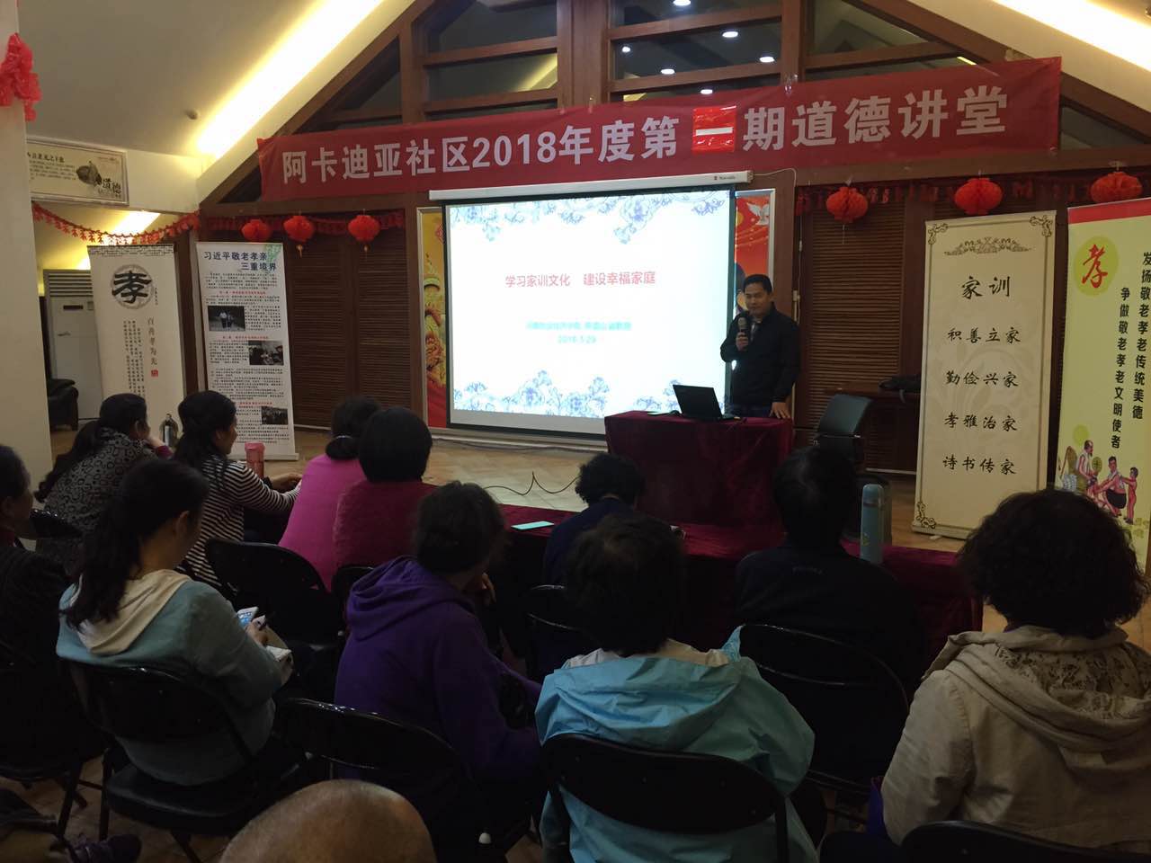 为了弘扬优秀民族传统文化,践行社会主义核心价值观,根据学校“学习贯彻十九大 文明单位社区行”活动计划,2018年3月29日下午,太阳tyc9728组织老师走进阿卡迪亚社区,以“家风家教”为主题,为社区居民带去了一场精神盛宴。