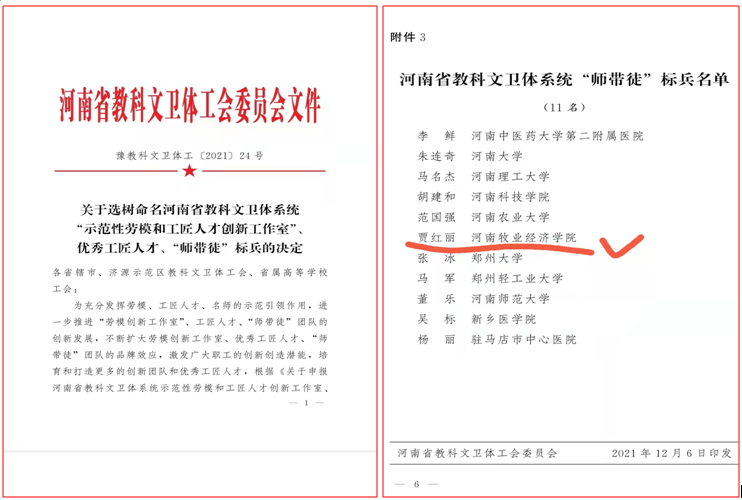 近日,从河南省教科文卫体工会传来喜讯,我院贾红丽老师荣获2021年河南省教科文卫体系统示范性“师带徒”标兵荣誉称号,此项殊荣全省仅有11对。