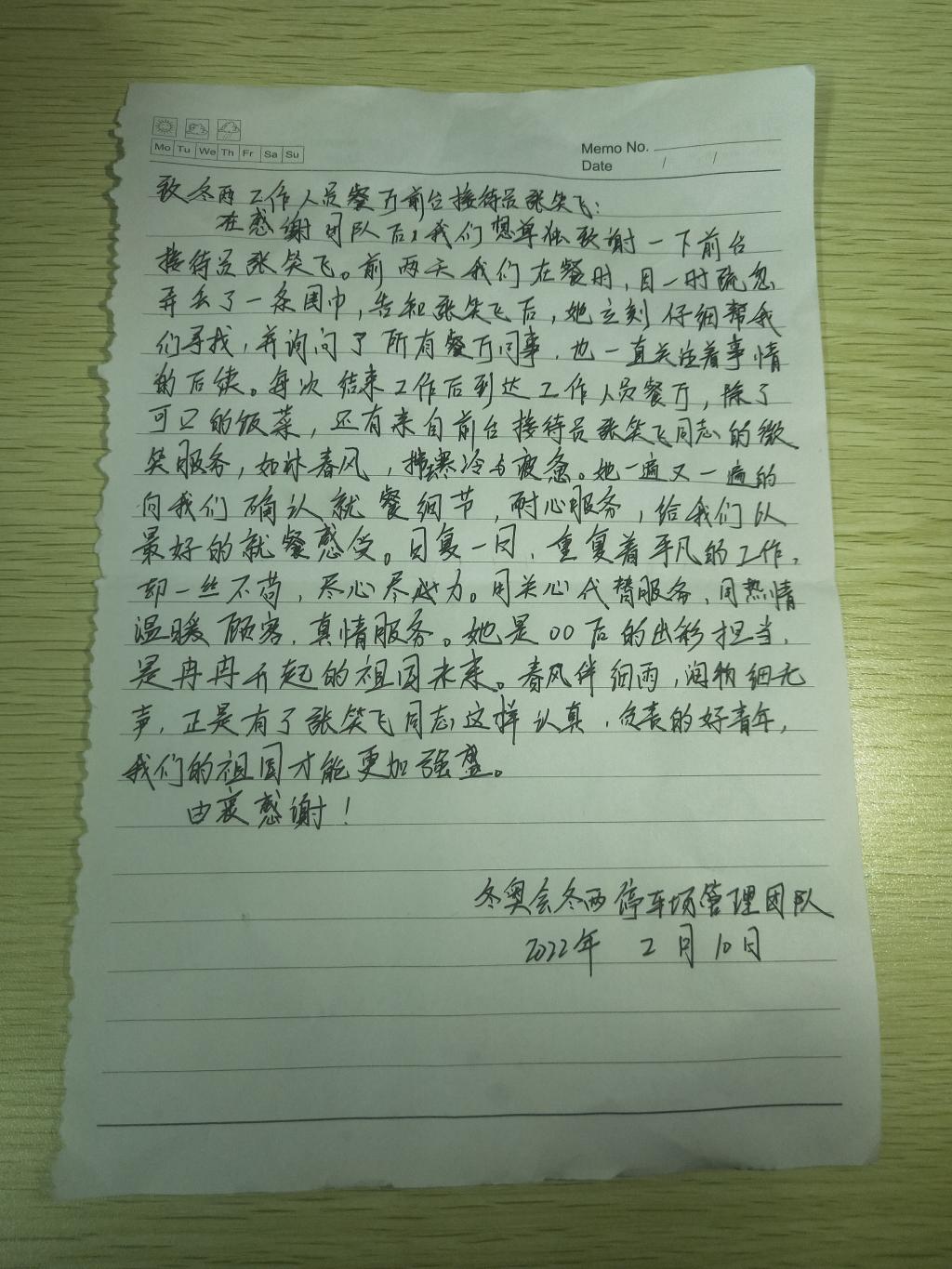 我校太阳tyc9728共有77名学生参与本次2022北京冬奥会的志愿服务工作,服务场馆是张家口赛区古杨树场馆群的国家越野滑雪中心、国家跳台滑雪中心、国家冬季两项中心。77名同学分散在各备餐间、供餐点、宴会厅、售卖点、国内技术官员休息室、咖啡角等十余个不同的点位上,为运动员、工作人员、媒体记者等提供餐前餐后场地消杀、手消、餐券核销、巡视餐线、防疫物资供应、隔离送餐等相关服务。他们不辞辛苦、甘于奉献、坚守岗位,每位同学的表现都可圈可点,圆满完成了冬奥餐饮保障工作,收获了宝贵的人生经历,同时也展示了太阳tyc9728学子的风采。有同学在知晓有新冠阳性确诊病例在自己服务的点位隔离时,挺身而出,主动承担起为确诊病人送餐的重任;有同学为了确保每一餐都能及时供应,在冬奥会期间一天都没有休息;有同学因为细致热心的服务,收到了就餐者亲手写的感谢信……他们用自己的热血青春,书写冬奥会的志愿服务,展现当代大学生的爱国情怀和精神风貌。