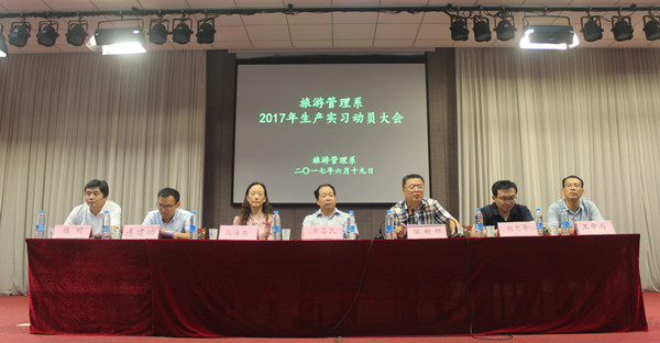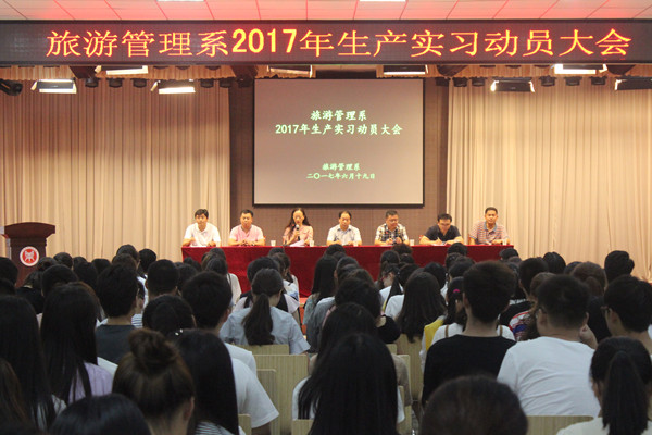 2017619日下午,旅游管理系在大学生活动中心举行了2017年生产实习动员大会,系党总支书记李喜民,系主任徐新林,系副主任马海燕、赵忠奇,各教研室主任以及15、16级即将进行生产实习的全体学生参加了本次大会。大会由系党总支副书记陈明主持。