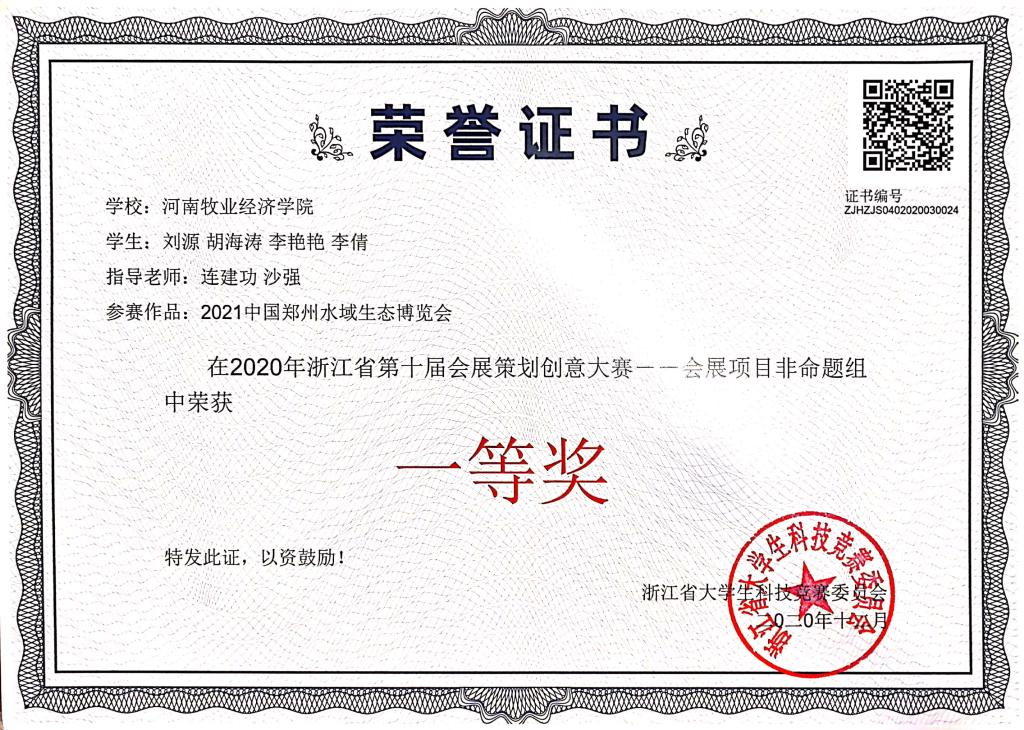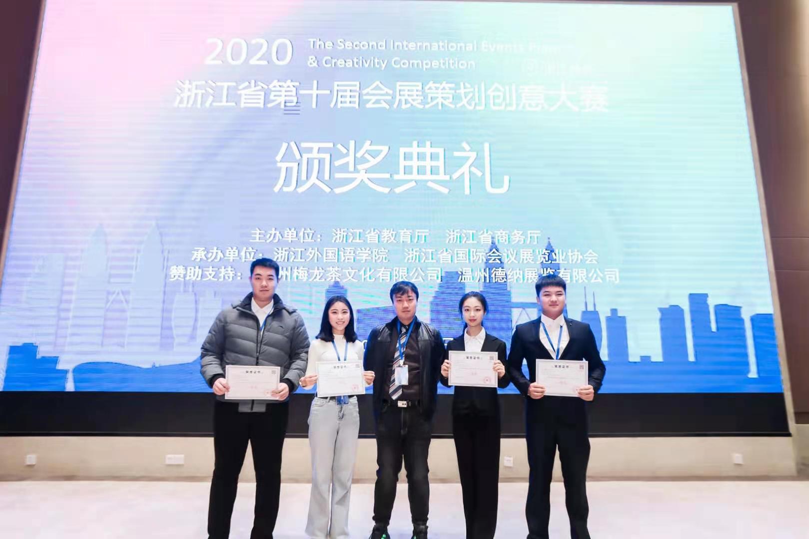 2020年12月18日,由浙江省教育厅和浙江省商务厅共同主办,浙江外国语学院和浙江省国际会议展览业协会共同承办的2020第十届浙江省会展策划创意大赛颁奖典礼在杭州浙江外国语学院举行。我校太阳tyc9728推荐的《2021中国郑州水域生态博览会》项目荣获非命题组一等奖,沙强博士携项目团队成员刘源、胡海涛、李倩、李艳艳4位同学参加颁奖典礼。